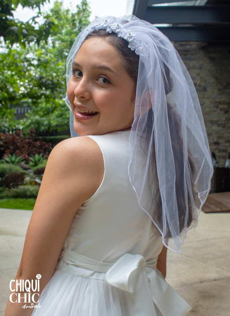 Velo de 18" en diadema - Flores de organza con centro de zirconia y flores de seda.